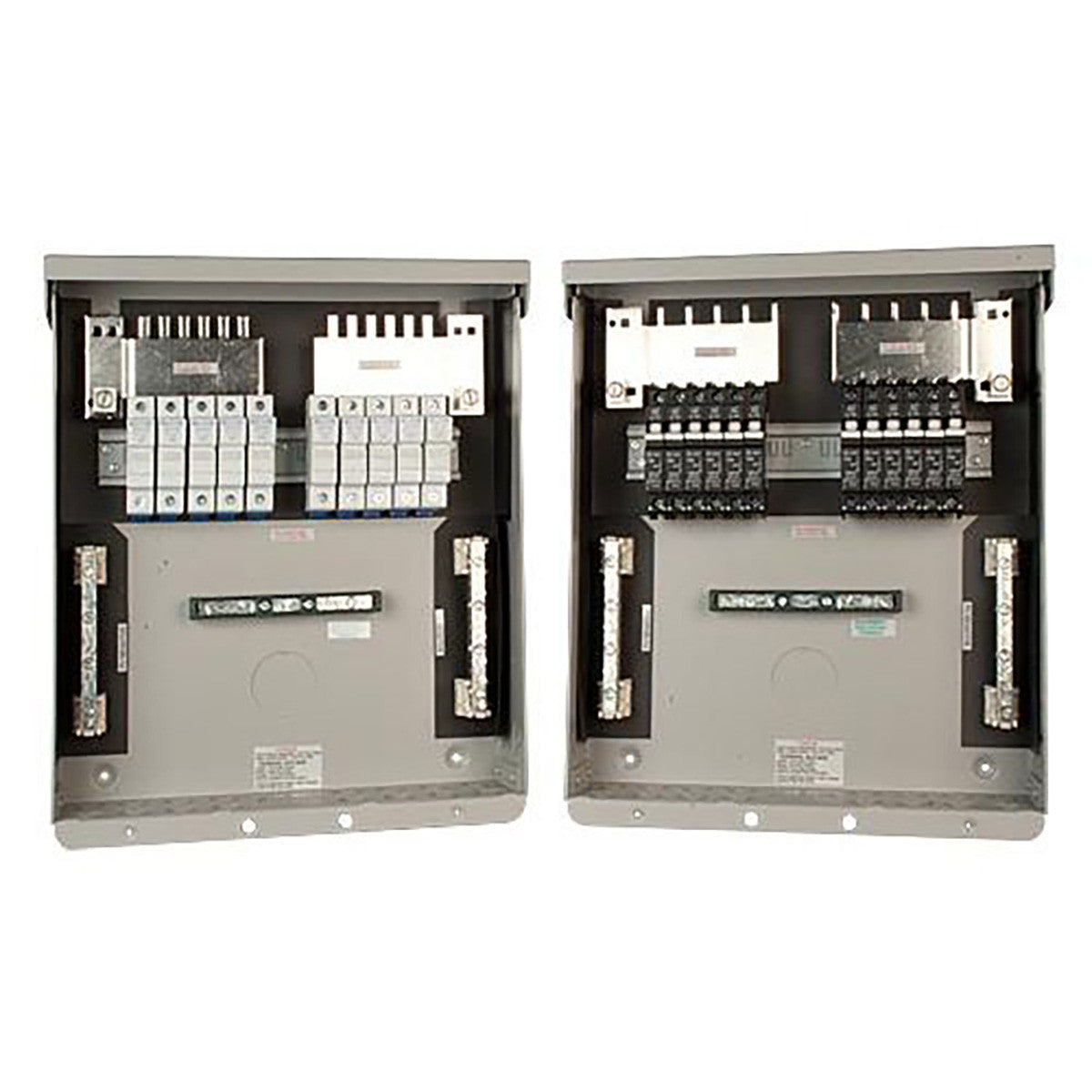 (For 150 VDC charge controllers and 600 VDC grid tie inverters) Gray aluminum type 3R rainproof enclosure with insulating dead front, will accept 12 150VDC breakers or 10 touch-safe fuse holders. Can support two inverters of up to 5 strings each, or a transformerless inverter of up to 5 strings.